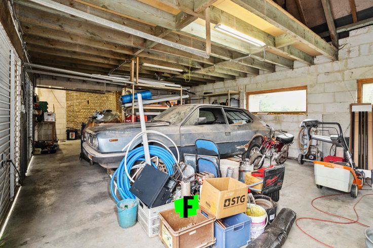 De dubbele garage + opbergplek is in uitstekende staat en kan hergebruikt worden.