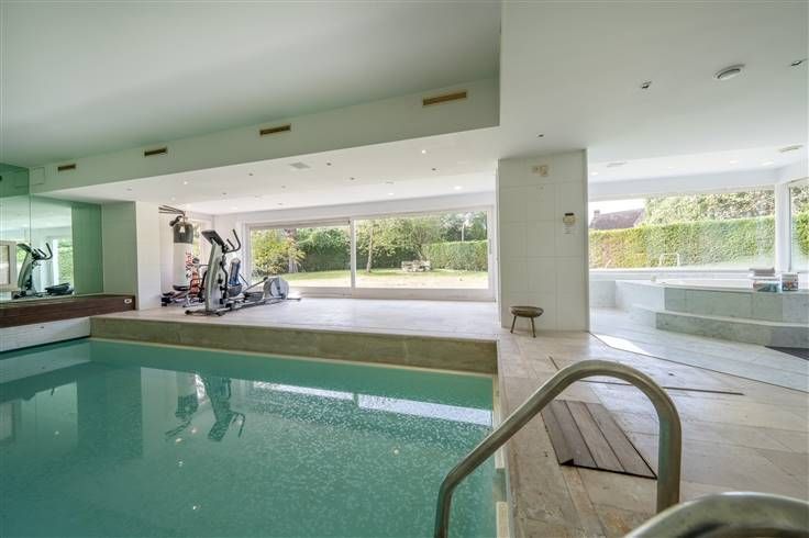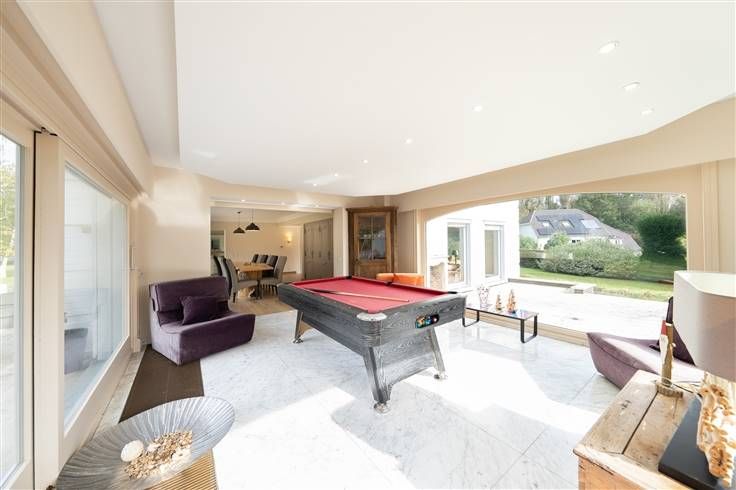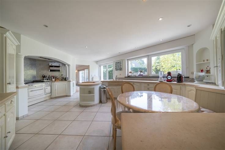 GELIJKVLOERS (400m²): ruime inkom, aparte ingang leidend naar een studio, prachtig salon (66m²) met bar en authentieke schouw, grote eetkamer (31m²), zithoek met biljarttafel (5m30x4m35), ruime eetkeuken (6m55x4m65), bureel of slaapkamer, binnenzwembad met jacuzzi en douche, dubbele garage, ruime terrassen en prachtige tuin