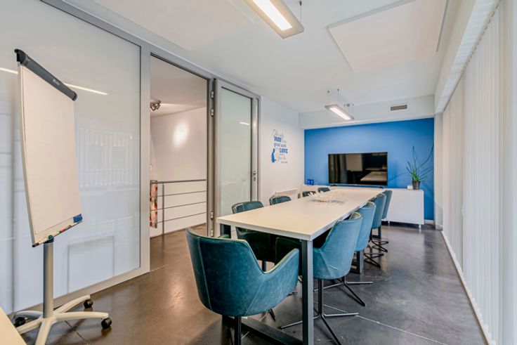 Het pand kan naar wens worden ingedeeld. Het gelijkvloers omvat een grote, open ruimte, die momenteel wordt aangewend als vergaderzaal, diverse burelen, sanitaire voorzieningen, een praktische berging en een koffiehoek.