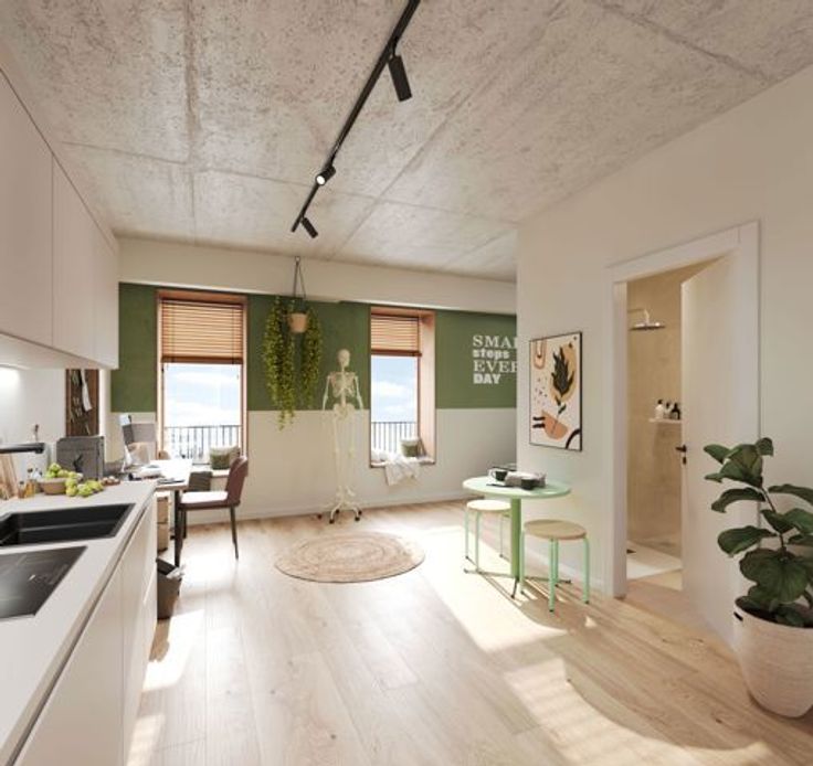 3. Type XL: Luxe studentenstudio met privé sanitair (douche en toilet) én eigen kitchenette voor extra comfort en zelfstandigheid.