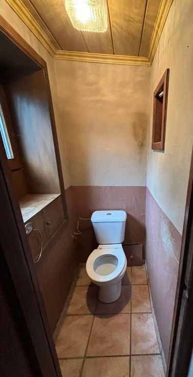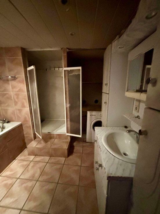 Rdc : Salle à manger, salon en contre-bas, cuisine équipée, salle de bain, WC séparé.
