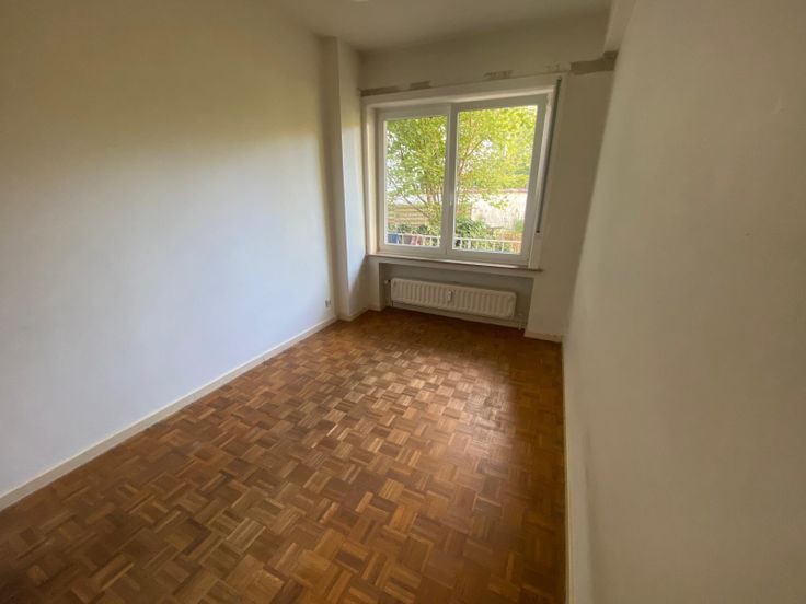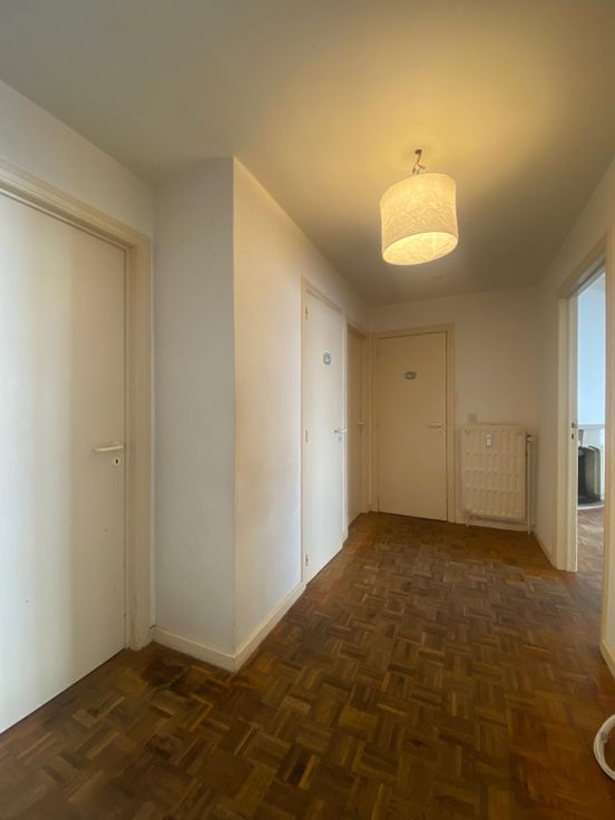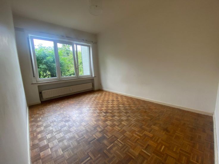 Living (± 30 m²) + 2 chambres (± 15 et ± 11 m²) + salle de bains + wc séparé + cuisine équipée + petite terrasse + cave