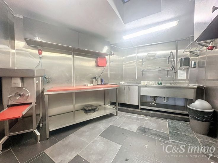 De gelijkvloerse verdieping, momenteel verhuurd als slagerij, beslaat ongeveer 80m² en beschikt over een koelruimte, een ruime keuken van 18m² en een technische ruimte. Een aparte zijingang waarborgt de privacy van de woonst. Op de eerste verdieping vindt u een lichte leefruimte met grote ramen, een keuken van ca. 12m², twee volwaardige slaapkamers en een berging. De badkamer is voorzien van een ligbad, dubbele lavabo en toilet.