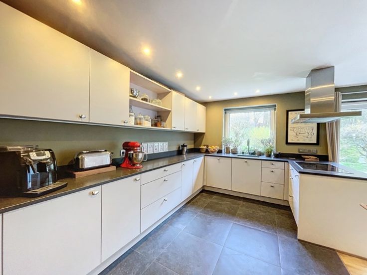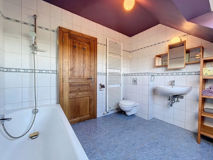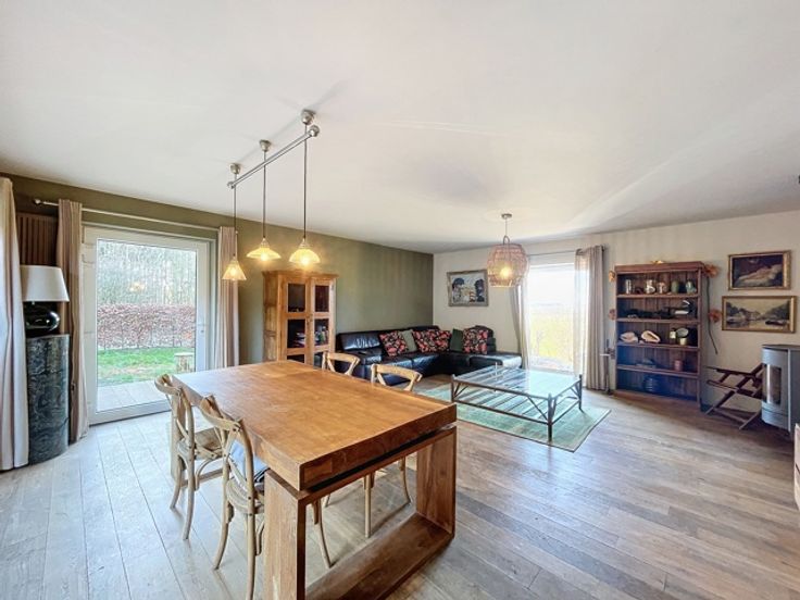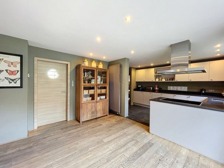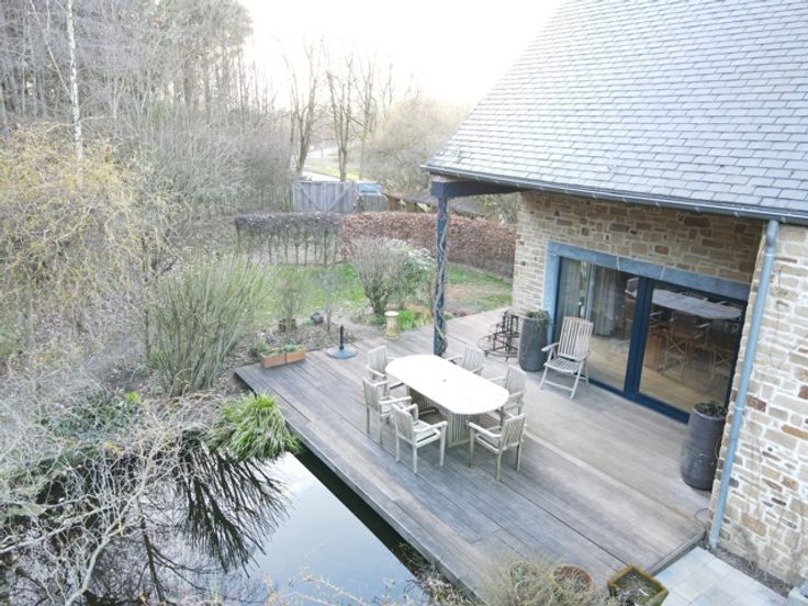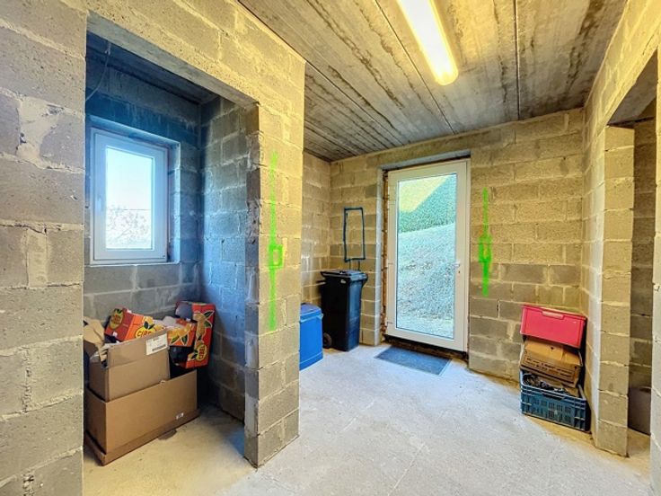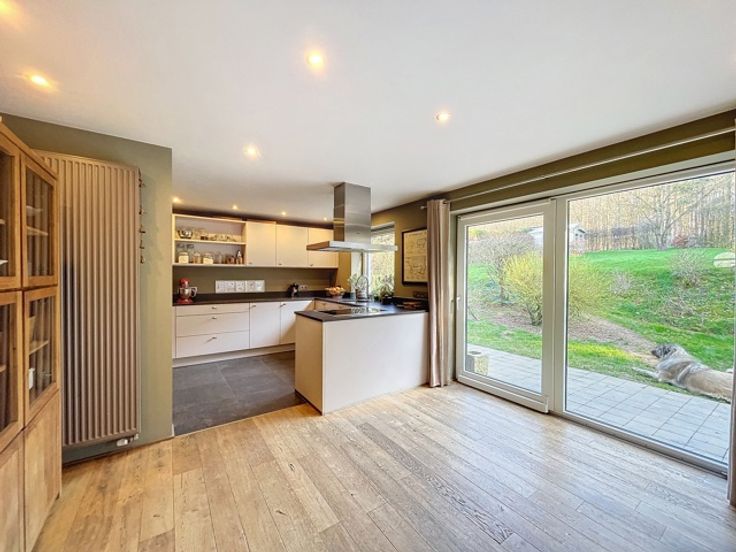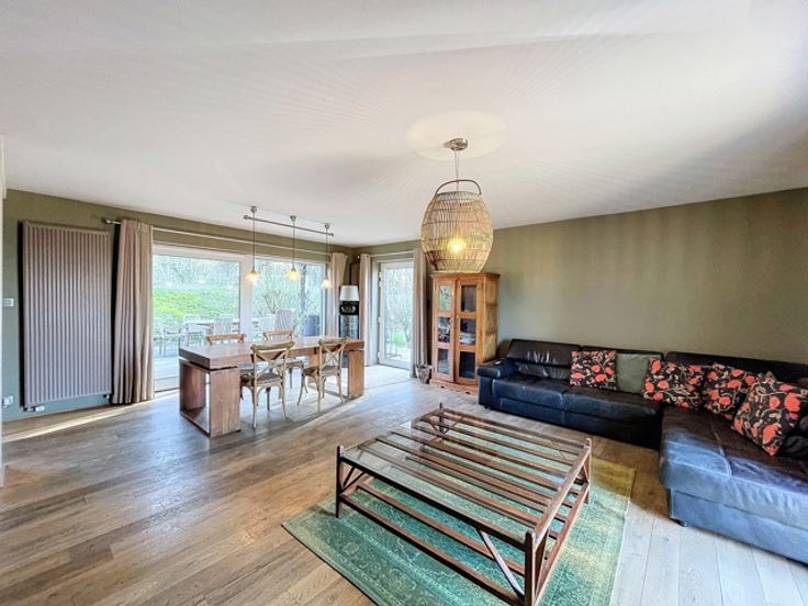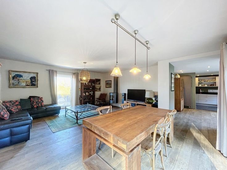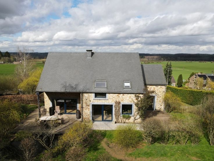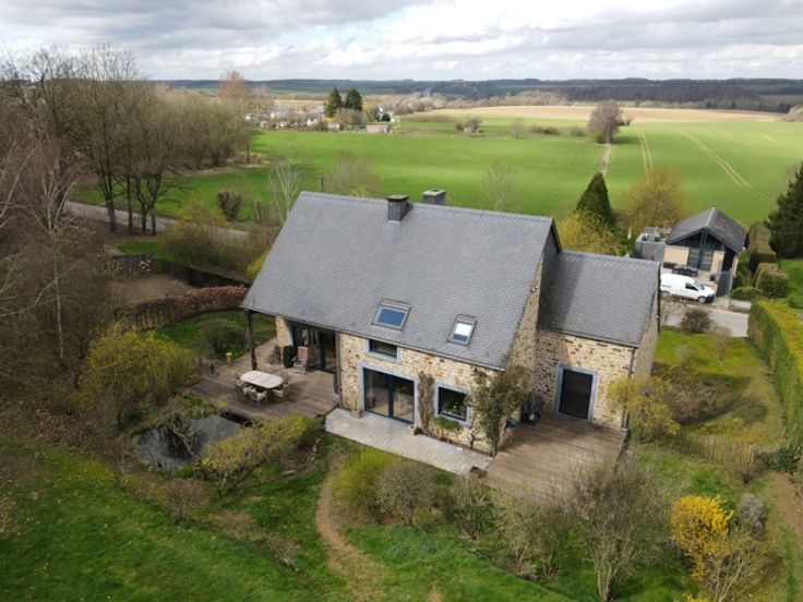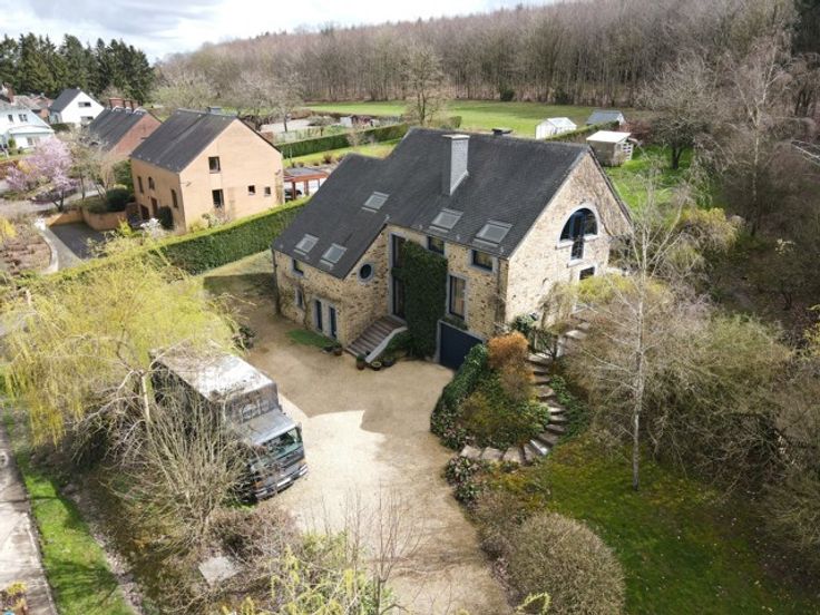 VENDU!!! A découvrir à l'entrée du Hameau de Monin, cette très belle villa construite en 2006 en pierre de pays et implantée sur un terrain d'un peu plus de 15 ares! Cette propriété vous ravira par ses espaces de vies généreux et très lumineux. D'une surface habitable de 225m2, le bien dispose d'un très grand séjour avec poêle à bois de marque STUV, d'une cuisine équipée avec accès sur le jardin et une première terrasse communiquant aussi avec le séjour. Vous profiterez également d'une suite parentale avec dressing et salle de bains attenante (douche à l'italienne - baignoire - évier) et accès à une seconde terrasse! Au 1er étage, vous aurez différentes possibilités d'aménagement en disposant d'une seconde salle de bains, de 2 ou 3 chambres ou d'un logement kangourou avec cuisine déjà existante. Au niveau rue, vous profiterez d'un spacieux sous-sol de 140m2 avec un garage, buanderie et espace atelier et surtout une possibilité d'aménagement de +/- de 70m2 d'un espace professionnel avec un parking facile pour recevoir sa clientèle/patientèle! Point de vue extérieur, vous bénéficierez d'un jardin entièrement clôturé et aménagé avec un abris de jardin, un plan d'eau et de deux terrasses! Côté technique : chauffage central au mazout - toiture en ardoises naturelles - châssis pvc double vitrage - citerne d'eau de pluie 10 000L - micro-station d'épuration - très bon PEB label C! Faire offre à partir de 450 000 € (sous réserve d'acceptation du propriétaire)!