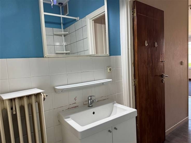 Inkomhal met vestiairekast, apart toilet, living op laminaat, keuken, polyvalente ruimte (berging, dressing, bureel...), badkamer met ligbad, 2 slaapkamers en terras van 2.4 m².