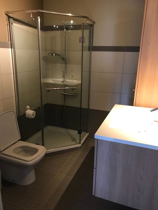 Gezellig en knus appartement dat beschikt over een woonkamer met open keuken die toegang verleent tot de slaapkamer en badkamer. Via de woonkamer is er ook toegang tot de twee terrassen. Badkamer bestaat uit een badkamermeubel met lavabo, toilet en douche.