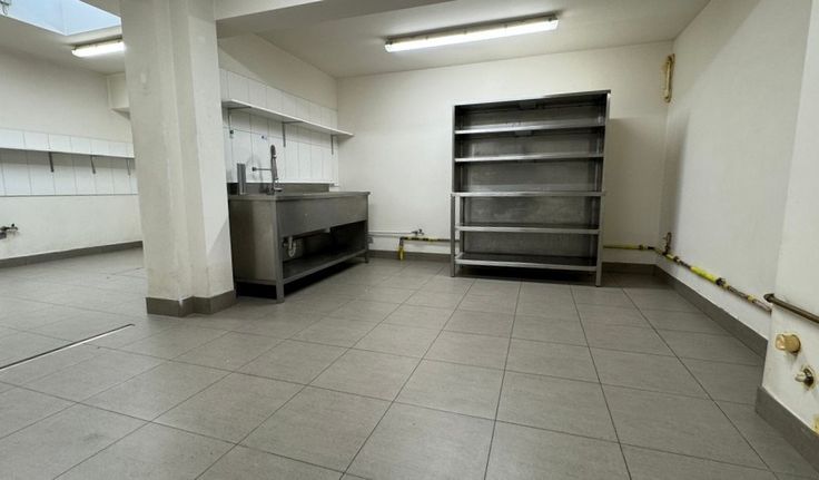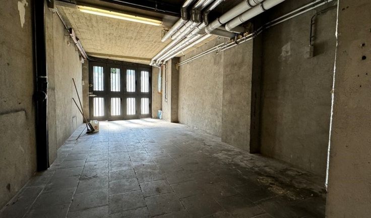 Indeling: winkelruimte, sanitair blok, keuken (niet ingericht), opslag/garage, verdieping met woonkamer, slaapkamer en badkamer, zolder (60m²) en kelder (65m²)