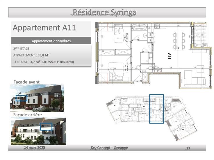 Sorry er is geen nederlandse vertaling beschikbaar. 80% DEJA VENDUS !!! Il reste 3 appartements à vendre, dépêchez-vous ! Au coeur de Genappe, dans la commune la plus montante du Brabant Wallon, au coeur des axes qui vous sont chers, vers Nivelles, Louvain-la-Neuve, Charleroi- Waterloo-Bruxelles, cet immeuble avec ascenseurs, à l'architecture contemporaine, aux lignes épurées, est une topissime opportunité ! Belle luminosité, appartements super fonctionnels, répondant aux dernières normes énergétiques en terme de chauffage, isolation thermique, acoustique. Belles finitions, en fonction de l'avancement des travaux au moment de votre achat, vous pourrez choisir celles-ci. Le jardin commun qui sera aménagé et arboré sera magnifique, super convivial. L'immeuble comprend 14 appartements, 3 commerces, 14 caves, 7 garages et 11 empl.pkings intérieurs.Proches des écoles, commerces, commerces de proximité, vous pourrez tout faire à pied. Genappe jouit d'un développement économique spectaculaire. L'appartement A11 sis au 2ème étage transversal propose +/- 88,8M² bruts : hall d'entrée, toilette visiteurs, buanderie, living avant avec cuisine USA super équipée incluse, accès balcon avant, salle d'eau, 2 ch arrières. Chaudière au gaz individuelle, châssis DV PVC avec ventilation, citerne eau de pluie, ventilation simple flux, isolation toiture 20cm, isolation façade 16cm. PEB au minimum sera "B". Vente sous loi Breyne. Tva 21% s/construction, droits enregist. s/terrain. Obligat° acq