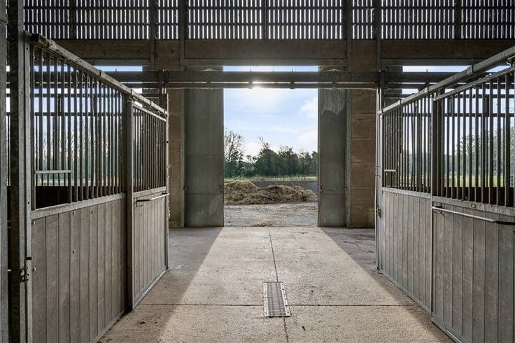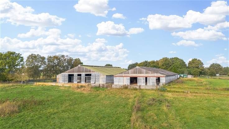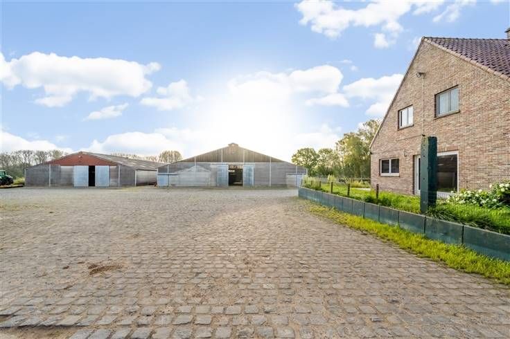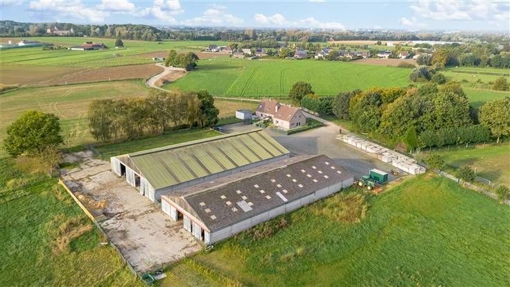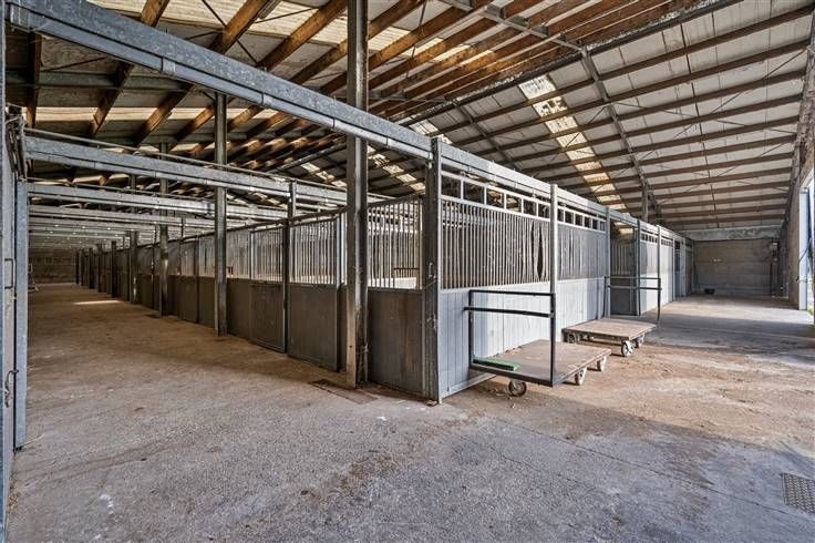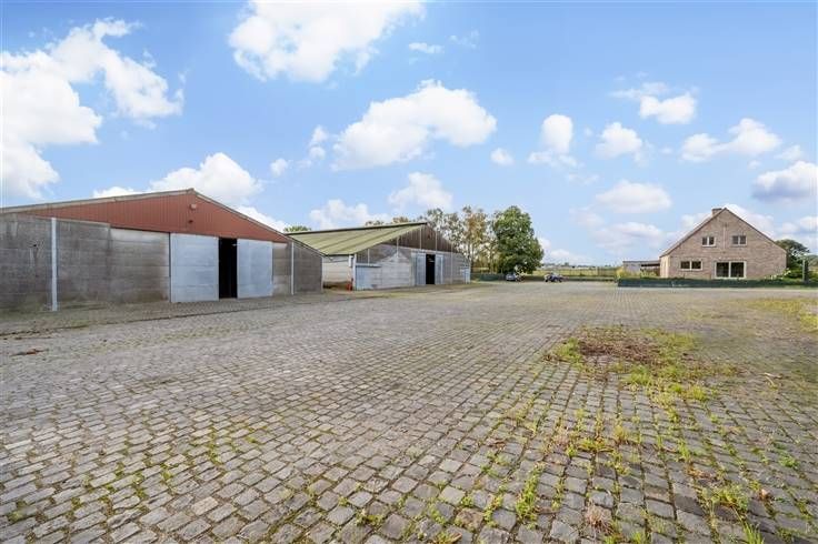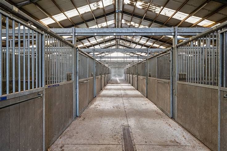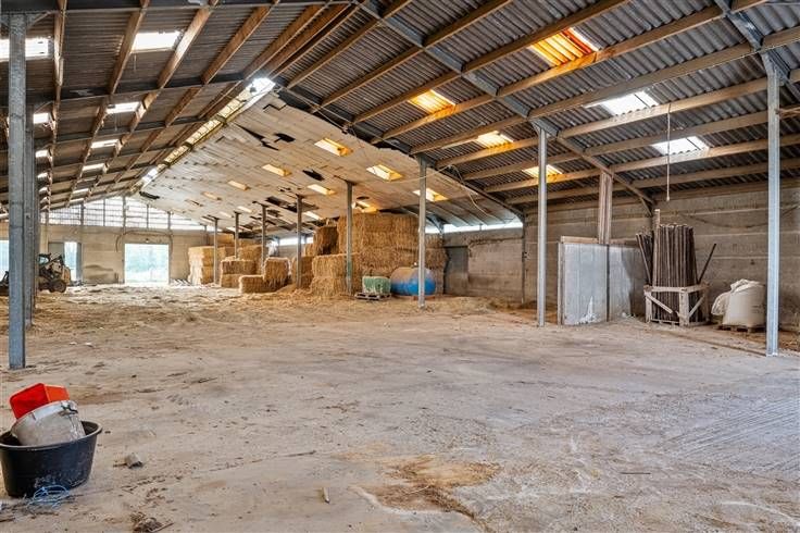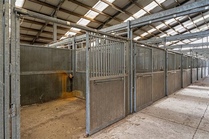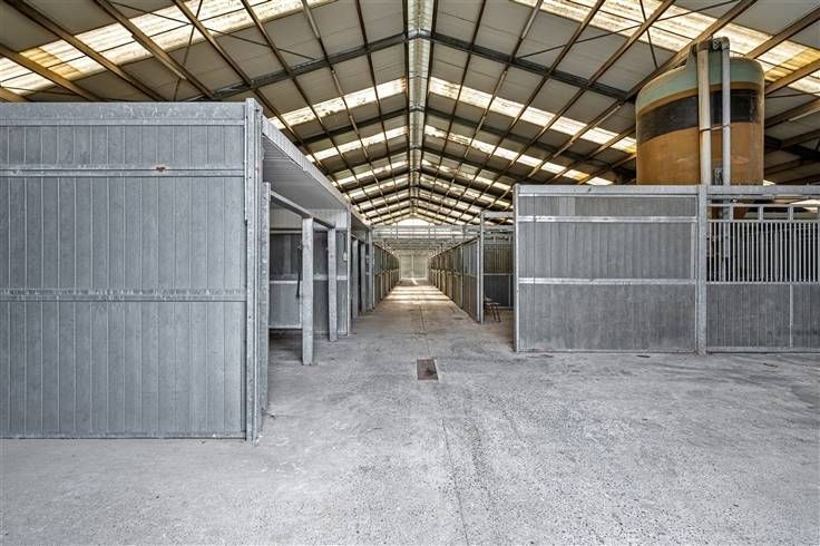 Achter de woningen bevinden zich 2 grote aaneensluitende stalgebouwen. De eerste loods meet 28m x 45,50m en is voorzien van 71 boxen van 3m x 3,50m, een wasplaats en solarium. De tweede loods is aanpalend en meet 20m x 45,50m, is voorzien vaan loopstallen en heeft verder voldoende opslagruimte.