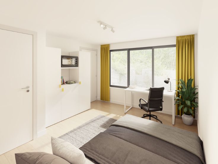 Deze stijlvolle residentie omvat 6 charmante studentenkamers (waarvan 1 met mezzanine), uitgerust met eigen sanitair, ontbijthoek met koelkast en microgolfoven, bed, bureau en -stoel, dubbele kleerkast en verduisterende, brandvertragende gordijnen.