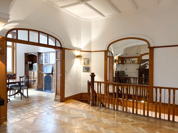 Op de eerste verdieping, een ruime eetkamer van ± 30 m² vol licht en een aangename woonkamer met open haard.