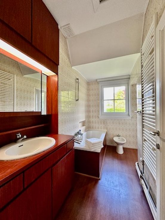Badkamer met ligbad, toilet, bidet, lavabo en handdoekwarmer.