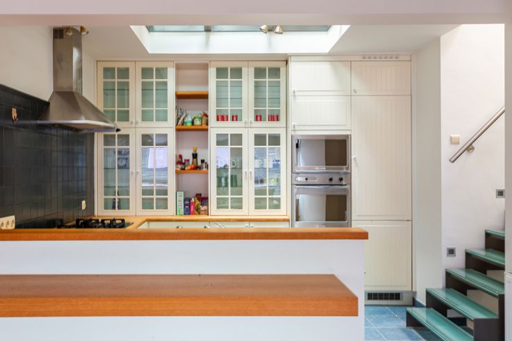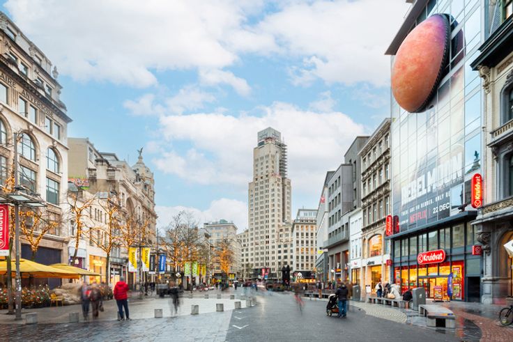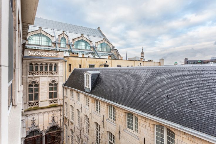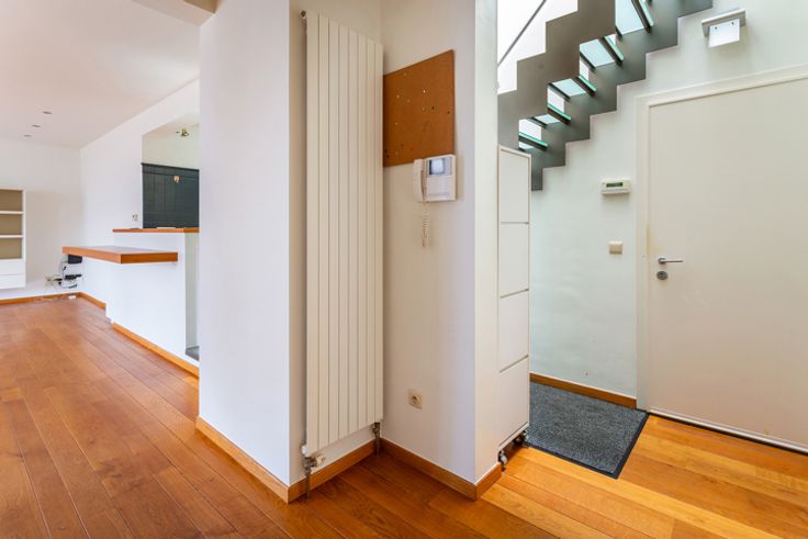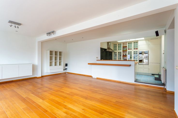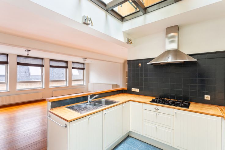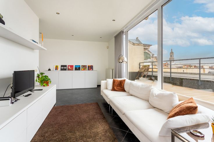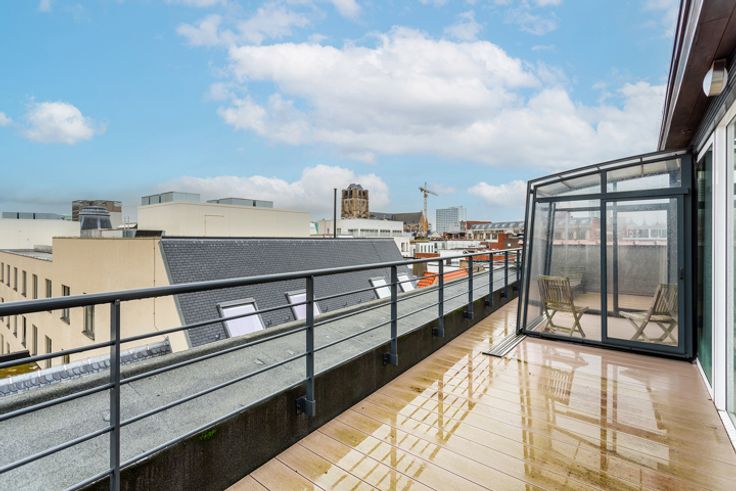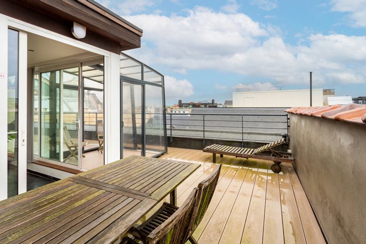 Ruim duplex dakappartement ca. 170m² met panoramisch zonneterras ca. 50m² en open uitzicht gelegen op absolute toplocatie in het centrum van Antwerpen aan de Handelsbeurs, de Boerentoren, op wandelafstand van de Meir, Huidevetterstraat, Wilde Zee, openbaar vervoer, scholen, tal van trendy winkels en restaurants.  INDELING: INKOMHAL ca. 3,23m x 3,27m op parket met vestiaire en apart gastentoilet met handenwasser Ruime LEEFRUIMTE ca. 6,5m x 6,8m op parket aansluitend de open ingerichte landelijke KEUKEN ca. 3,23m x 3,27m voorzien van opbergkasten, ontbijthoek en toestellen: 1,5 spoelbak, gasvuur (5-spits), dampkap, afwasmachine, oven, ijskast en vriesvak. Op deze verdieping heeft u 2 SLAAPKAMERS ca. 3,6m x 2,71m en ca. 3,91m x 3,4m waarvan één met een ingemaakte kastenwand, ingerichte BADKAMER voorzien van een ligbad met douchemogelijkheid, dubbele lavabo in een meubel, handdoekdroger. De aansluitingen voor wasmachine en droogkast zijn hier voorzien en discreet weggewerkt.  De  glazen design trap geeft u toegang tot de bovenverdieping. Hier heeft u een open polyvalente ruimte ca.43m² thans ingericht als tv-, zithoek met aparte bureauruimte voorzien van ingemaakte kasten. Deze ruimte kan ingedeeld worden naar een extra slaapkamer met dressing indien gewenst. Verder is er ook een DOUCHEKAMER met douche, lavabo, handdoekdroger en een toilet. Heerlijk genieten kan u op het zonnig DAKTTERAS ca. 50m² met open uitzicht.  Op het gelijkvloers bevindt zich een bureauruimte/studio v
