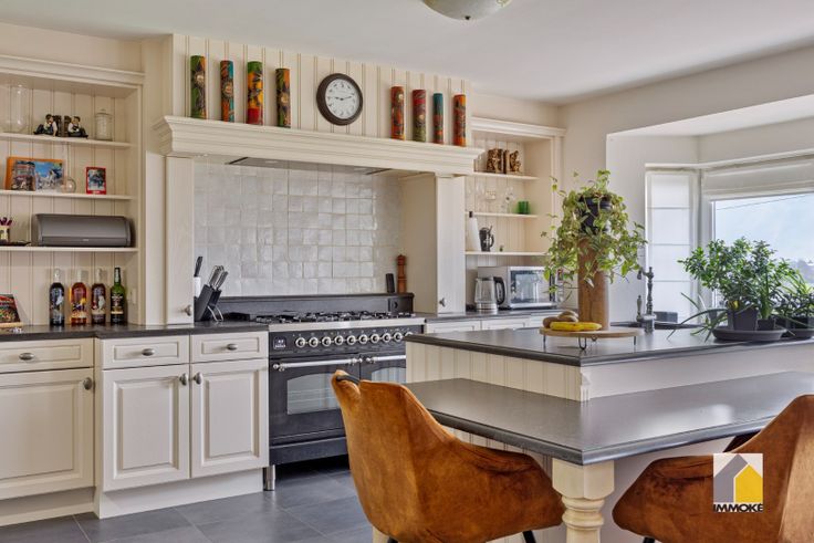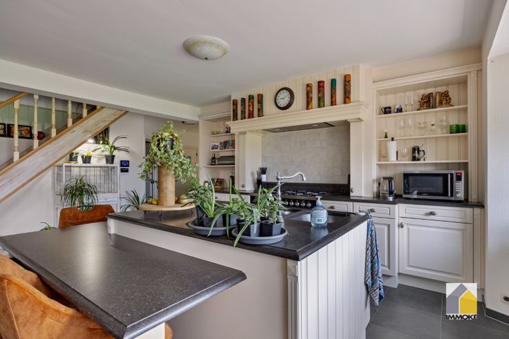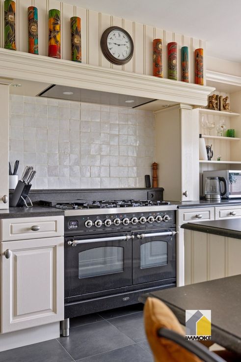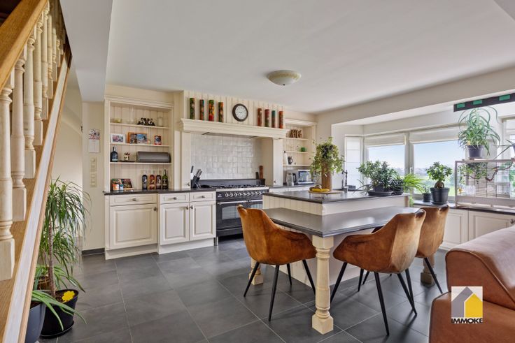 - VERDIEPING 1: Overloop, riante leefruimte (7,89 x 4,06 m) met landelijke keuken voorzien van Boretti fornuis, koelkast en werkeiland met zitgedeelte. Woonkamer met TV-maatkast en smaakvolle gashaard met schouwmantel. Dressingruimte (3,85 x 3,86 m) met toegang naar slaapkamer 1 (5,54 x 4,08 m), badkamer (3,00 x 2,90 m) voorzien van ruime inloopdouche, dubbele wastafelmeubel en toilet, berging (4,00 x 3,50 m) met aansluitingen voor wasmachine en droogkast, bergzolder onder het dak.