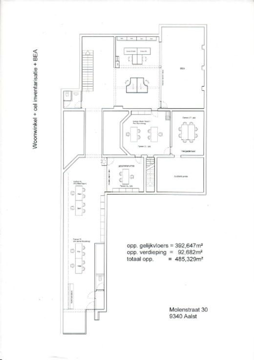 Molenstraat, ruim handelspand met polyvalente ruimtes, lokaal op 1e verdieping alsook grote droge kelder, lichtstraat en kleine tuin, voorheen gerenommeerde kledingzaak en kookwinkel.
