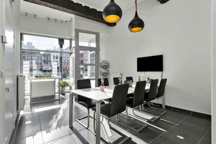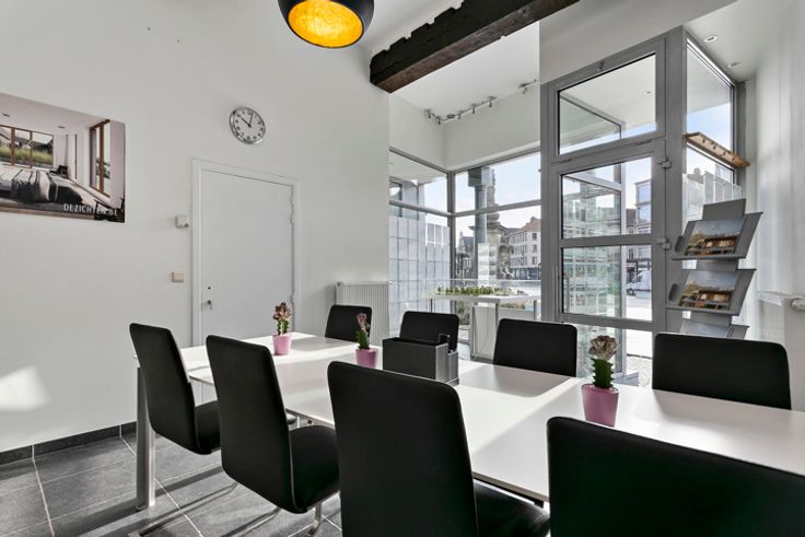 Kantoorruimte voorzien van grote etalage op de Veemarkt in Mechelen. Dit kantoor beschikt over 2 ruimtes, in te richten volgens uw behoeften. Voorts uitgerust met een kitchenette en apart toilet. Extra opslagruimte voorzien in de gemeenschappelijke kelder.