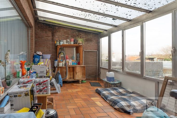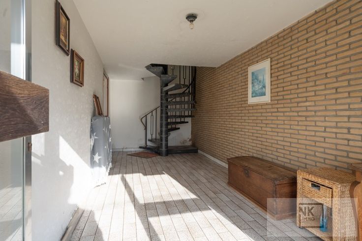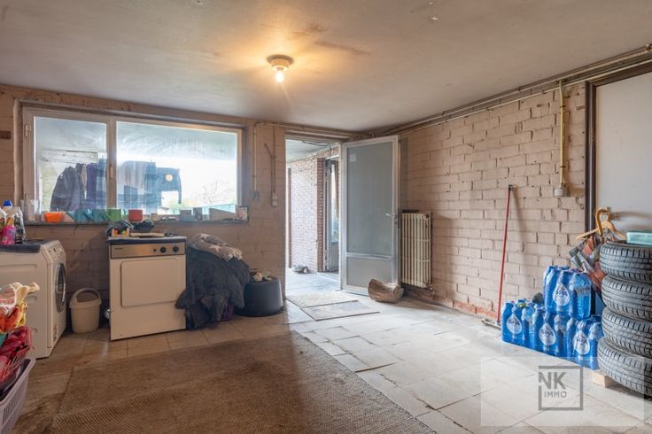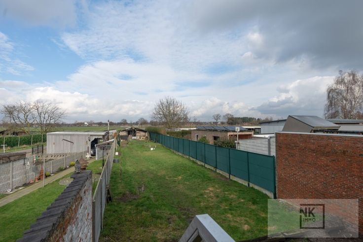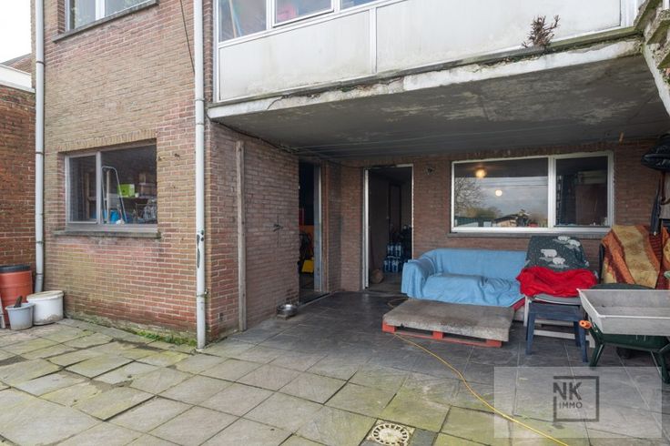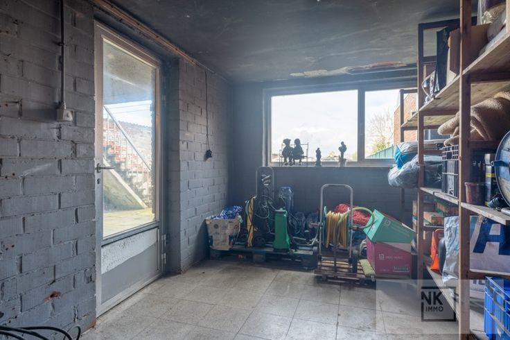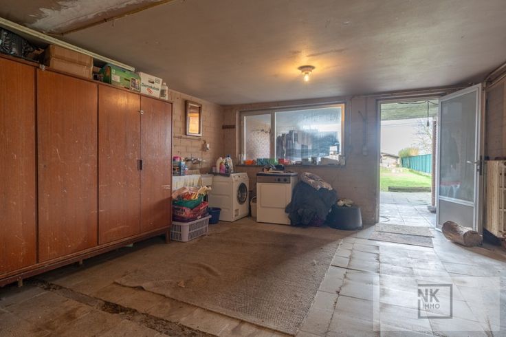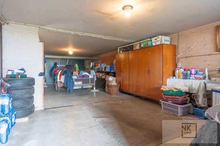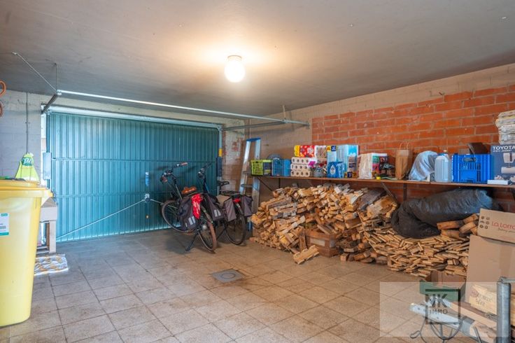 Als je de woning betreedt via de inkomdeur heb je links meteen de ruime inpandige garage met aansluiting wasmachine en droogkast. Verder loop je door naar het overdekte terras met een tuinberging. Er is een grote diepe tuin met achteraan groot schop en nog een stukje grond.