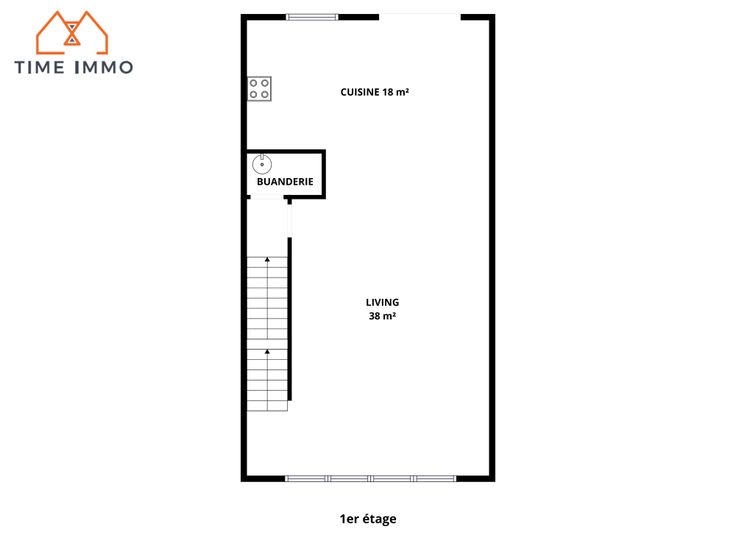 1er étage : Spacieux living, cuisine avec accès à la terrasse via la baie vitrée, buanderie ;