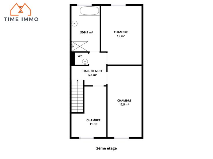 2ème étage : Hall de nuit desservant 3 belles chambres, une salle de bain ainsi qu’un WC séparé.