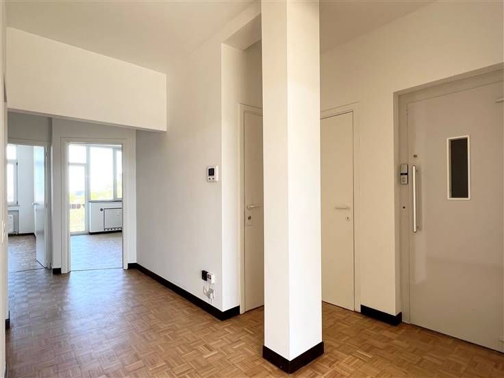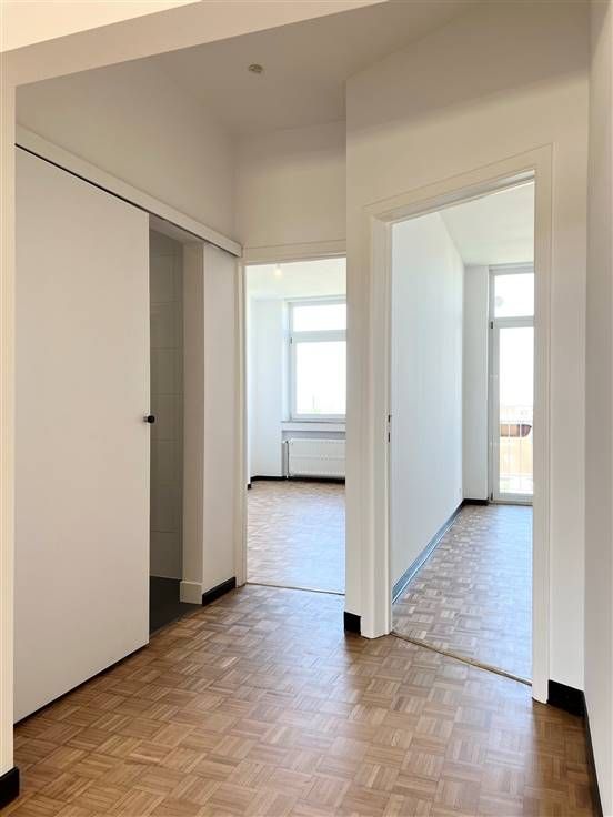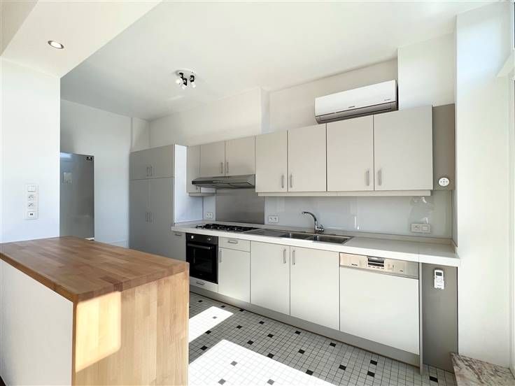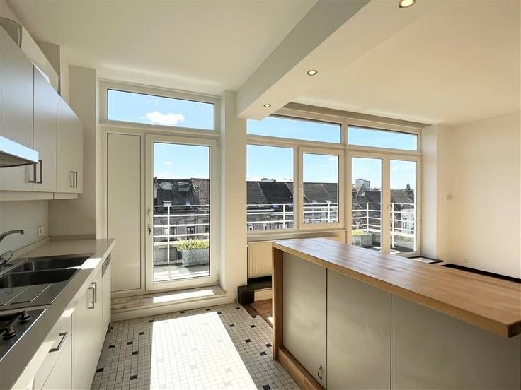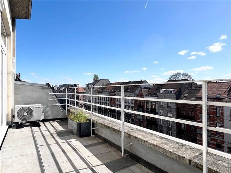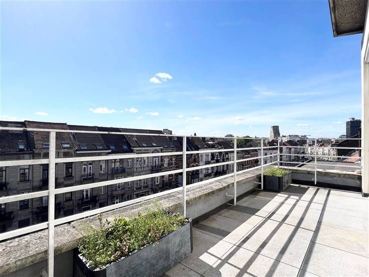 Ideaal gelegen tussen de wijk Flagey en zijn vijvers, het Terkamerenbos, de wijk Cimetière d'Elsene en de VUB, op de 5e en bovenste verdieping van een klein condominium van 5 appartementen, nodigen wij u uit om direct uit de lift te stappen in dit prachtig gerenoveerde appartement van +/- 109m² bruto (waarvan +/- 91m² netto). Hoewel de mooie woonkamer je zal verrassen met zijn lichtinval, open haard en mooie parketvloer, zal je meteen willen doorlopen naar het mooie zonnige terras van +/- 11,2m² met uitzicht op de buurt. Het terras is ook toegankelijk vanuit de ingerichte keuken, die in toegang staat tot de woonkamer. De woonkamer heeft een zonnescherm en airconditioning voor de mooie zomerdagen. Het tweede gedeelte van het appartement bevindt zich aan de achterzijde van het gebouw en heeft twee grote slaapkamers (+/- 15,8m² en +/- 16,7m²), waarvan één met privéterras. Het sanitair is apart en modern (toilet, doucheruimte en bijkeuken). Naast een kelder van +/- 4m² beschikt het appartement over een berging en kasten in bepaalde ruimtes. EPB G en elektriciteit conform tot 2049. Gemeenschappelijke gasketel, gemeenschappelijke warmwaterproductie en meters voor warm en koud water. De kosten omvatten ook de gemeenschappelijke ruimten met lift, de beheerkosten en het reservefonds. Een prachtig penthouse op een ideale locatie!