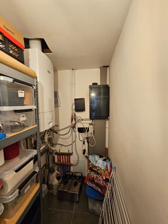 De zeer ruime, tweede woongelegenheid (+/- 176m²) op de verdiepingen omvat een (trap)hal, een toilet, een leefruimte (zithoek en eetplaats), een ruime ingerichte keuken, een bergplaats, een terras (17m²), 3 slaapkamers en een badkamer. Verwarming: CV op aardgas (ketel vernieuwd in 2023).