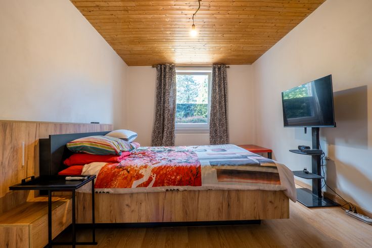 A l'étage: 2 chambres de 15 et 13m² et salle de douche avec wc.
