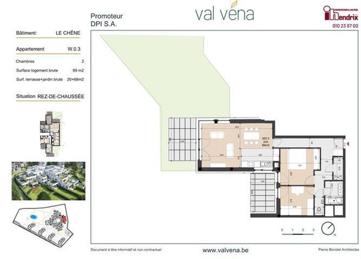 Né de la reconversion de l’ancien site Folon à Wavre, Val Véna offre un concept novateur. Ce nouveau quartier est la combinaison parfaite entre les facilités qu’offrent la vie urbaine de Wavre et le calme d’un environnement verdoyant garantissant quiétude et bien être à ses habitants. Les appartements Val Véna (1ch au 3ch et penthouse) sont entourés d’écoles de qualité, de nombreux commerces, d’une gare ferroviaire, d’un centre sportif et culturel tout en préservant l’intimité et le confort. Les plans sont travaillés de manière à ce que les bâtiments procurent à chacun ; ventilation, ensoleillement et éclairage naturel. Avec son look contemporain, le Val Véna offre tous les avantages d’une construction neuve répondant aux normes les plus récentes. Chaque appartement profite d’une belle terrasse. Au programme, des finitions de qualités : parquets et carrelages de qualité dans toutes les pièces, cuisine et salle de bains équipées et buanderie , le tout dans un look moderne et tendance. Le parc au centre de Val Véna incite à la balade et à la circulation douce (à vélo, à pieds, en transport en commun). Sa localisation rend également accessible des destinations telles que Bruxelles et Louvain-la-Neuve avec une facilité dû à sa proximité avec la gare, à la E411 et la N4.