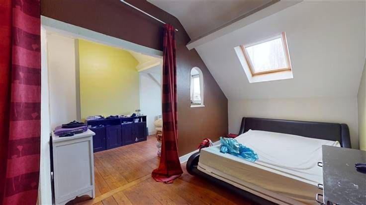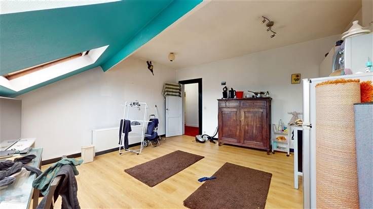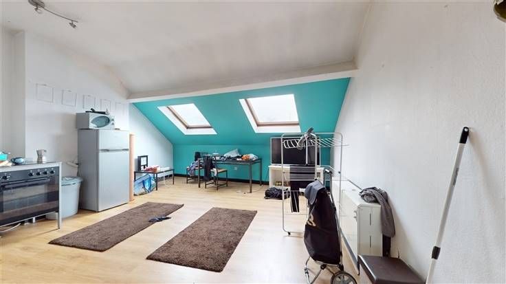 4ème étage (Superficie totale: +/- 82 m²):1 appartement mansardé avec 1 chambre. Loué : 456 €/mois (charges comprises).