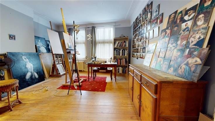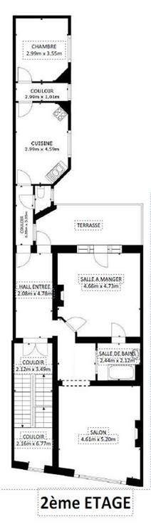 2ème étage (Superficie totale +/-121 m²) : 1 appartement de +/- m² avec 1 chambre et terrasse . Loué : 572 €/mois (dont 50 % prof.) + 149 €/mois forfait charges.