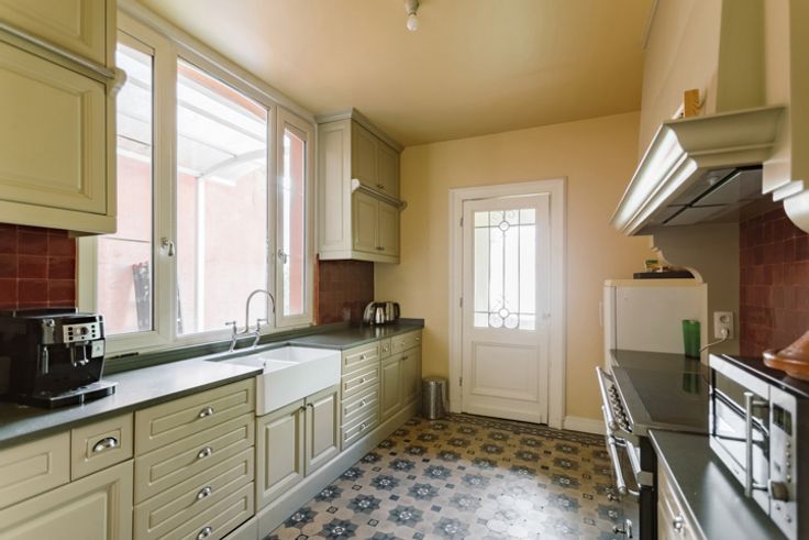 Op de benedenverdieping ligt een koninklijke vergaderzaal met authentieke muur- en plafondschilderingen, ornamenten en een sierhaard. Er is ook een tweede grote ruimte, vandaag ingericht als bureel. Achteraan een landelijke keuken met lichtrijke eetplaats. Aparte berging en toegang naar de tuin (22m breed!).