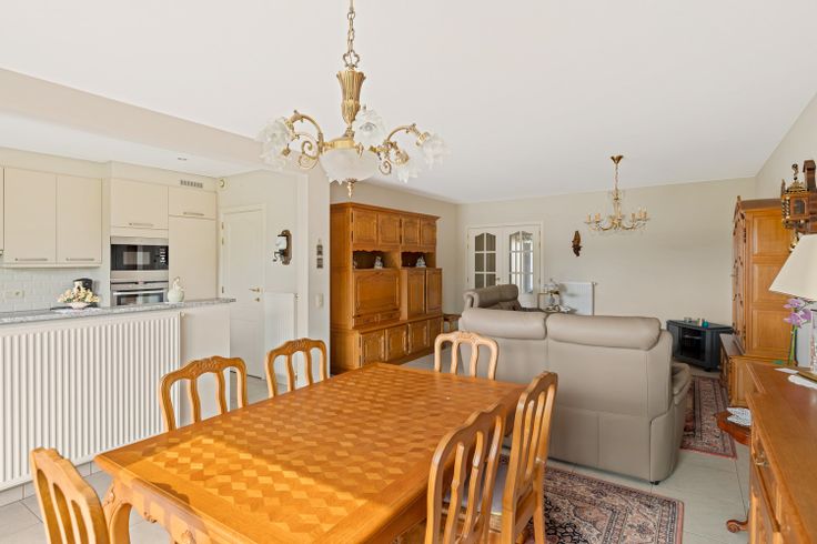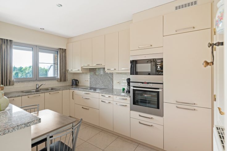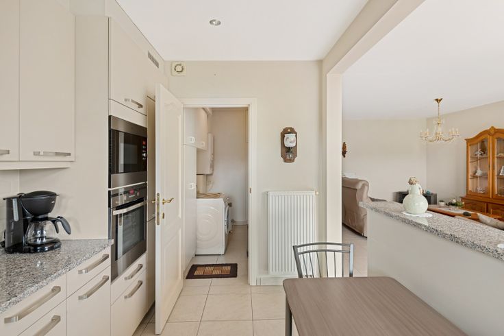 U komt het appartement binnen via de inkomhal dat u brengt naar de woonkamer. Via de woonkamer kunt u de volledig geïnstalleerde keuken en berging bereiken. Deze is voorzien van tegelvloer, aansluiting vaatwasser, granieten werkblad, keramische kookplaat, dampkap, combioven, microgolf, koelkast en diepvries. Bijkomend heeft u via de woonkamer toegang tot het gezellig terras.