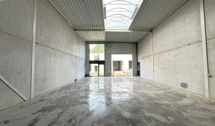 Specificaties: staalstructuur, 5,20m à 6m vrije hoogte, automatische sectionale poort, geïsoleerd steeldeck dak met centrale lichtstraat, polybetonvloer, afvoer sanitair, rookluiken