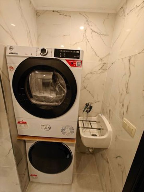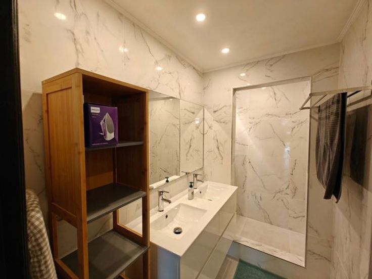 Les espaces communs à partager sont de 99,43 m² et comprennent un hall d’entrée, un salon/living aménagé avec goût, suivi d’une salle à manger et d’une cuisine entièrement équipée (vaisselle, lave-vaisselle, taque à induction, hôte, four, four micro-ondes, frigo de type « américain », d’un « airfryer », d’une machine à café, d’une bouilloire, etc.), d’une salle-de-bains, une salle de douche avec coin buanderie avec machine à laver et séchoir et de deux w.-c séparés.