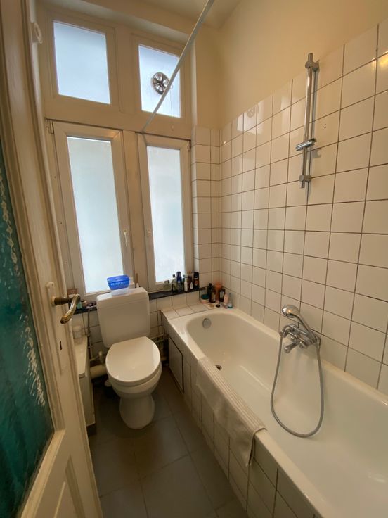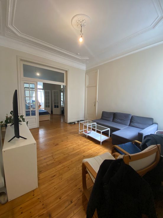 Spacieux appartement de 92 mètres carrés, constitué d’un salon, une salle à manger, une cuisine séparée semi-équipée (4 taques au gaz, four, emplacement lave-vaisselle ou machine à laver), une très grande chambre de 20 m2 avec coin dressing (ou petite pièce à utiliser pour du rangement), avec un balcon donnant sur la rue, une salle de bains avec WC, une cave privative.