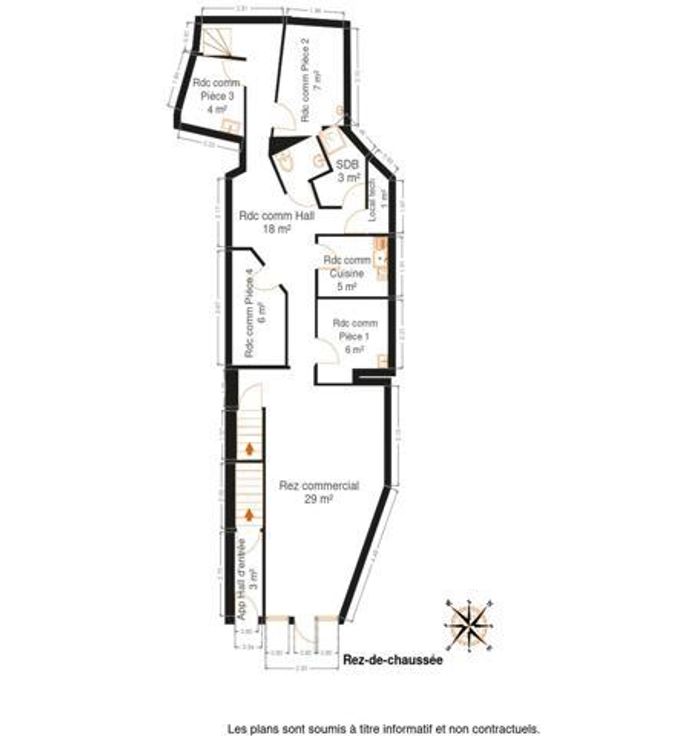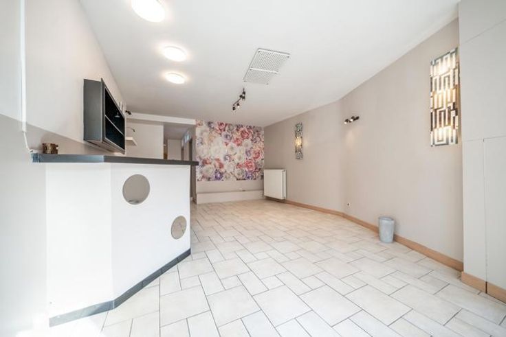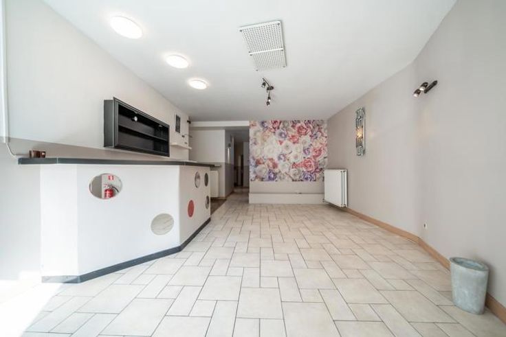 L’espace commercial présente une première pièce de près de 30 m², lumineuse et accueillante, Il comprend ensuite cinq pièces polyvalentes, dont une à l’étage, une petite cuisine, un WC, un local technique et une salle de douche. Une cave complète cet espace, offrant des possibilités de stockage supplémentaires.