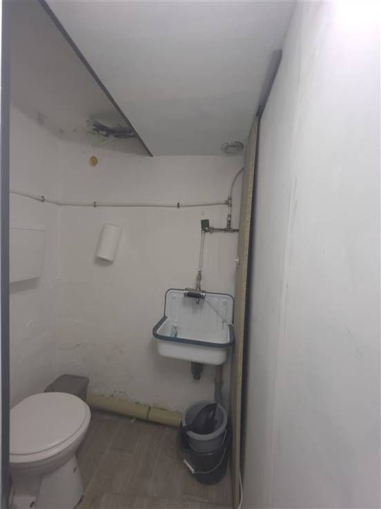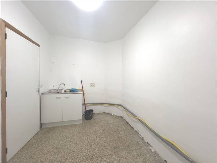 Commerciële oppervlakte van ± 45m² met kantoor/opslagruimte [tegelvloer; spoelbak] en apart toilet.