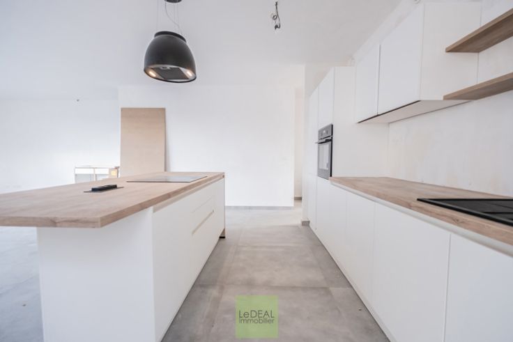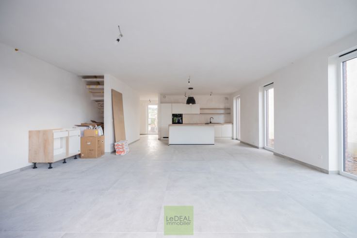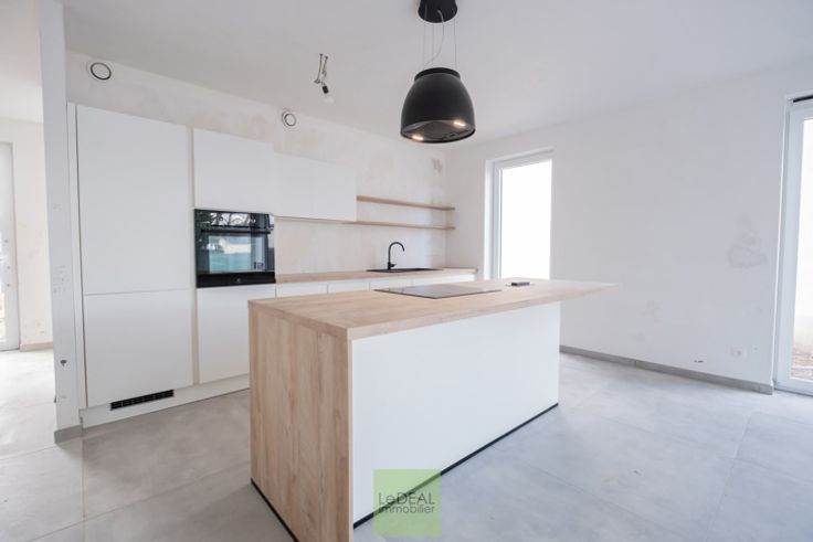 Cette maison se compose d’un hall d’entrée (13,86m²) avec vestiaire intégré donnant sur une toilette suspendue séparée (2,24m²), d’un vaste et lumineux séjour orienté est (50,29m²) avec cuisine full équipée (taque à induction, four, frigo et congélateur) avec un bel îlot central.