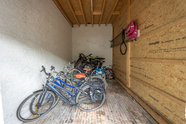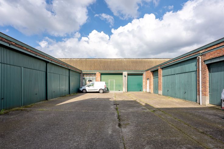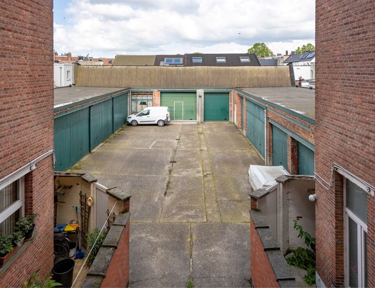 achteraan: koer met 12 garageboxen en fietsenberging - magazijn of werkplaats (ca. 270m²)