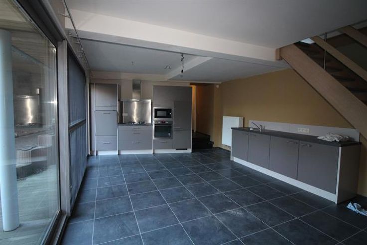 Indeling: Inkomhal met apart toilet, een bureel of slaapkamer, wasplaats met douche & wastafel en aansluitingen voor wasmachine, leefruimte met open keuken - schuifraam naar terras.