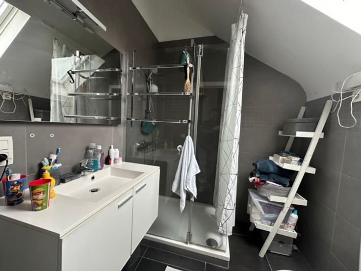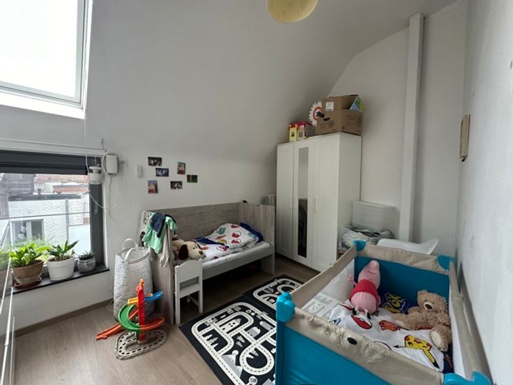 Op de eerste verdieping zijn er 2 slaapkamer en badkamer. Voorzien van veluxen met elektrische rolluiken.