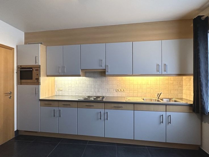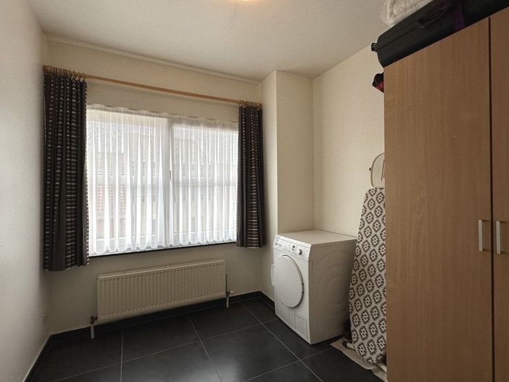 Via de inkomhal komen we in de lichtrijke leefruimte met open keuken voorzien van toestellen. De berging voorziet plaats voor de wasmachine.