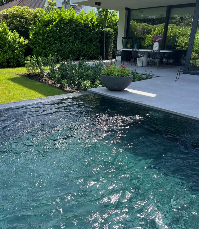 Bij het betreden van de inkomhal, voorzien van toilet en vestiaire, hebt u een prachtig zicht op de tuin met mozaïeken overloopzwembad met tegenstroom.