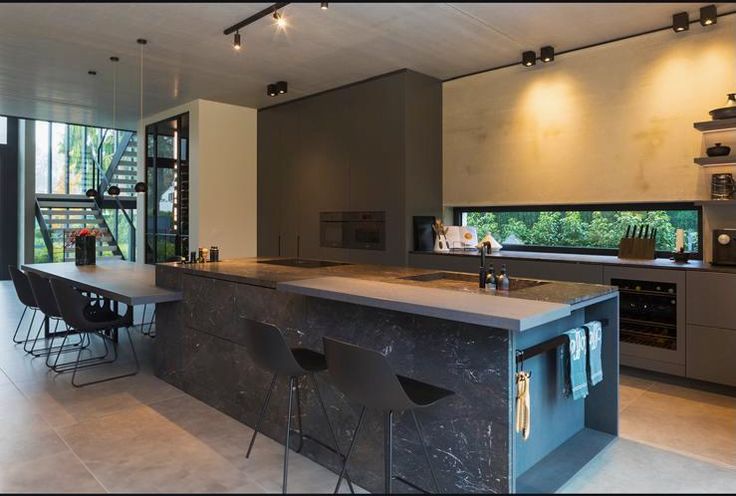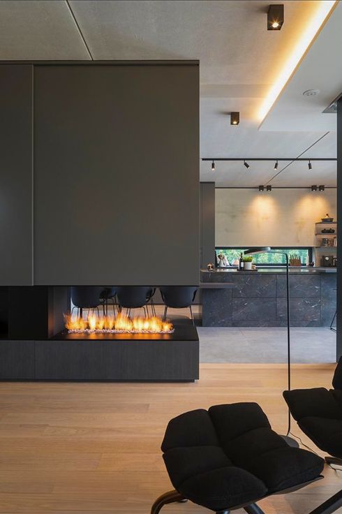 De open leefruimte met keuken en gas open haard vormt het hart van deze villa. De keuken is voorzien van alle luxe en comfort ( Miele toestellen, Quooker, quartsziet aanrecht,..)