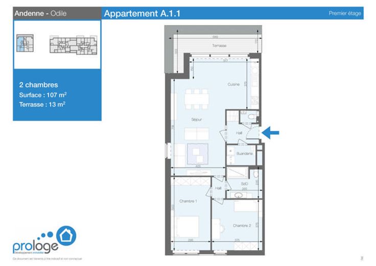 Situé au 1er étage, ce spacieux appartement 2 chambres de plus de 105m² est composé d’un hall d’entrée, une salle de douche avec wc, une cuisine ouverte super équipée, un spacieux séjour, deux chambres, une buanderie, un wc indépendant et une terrasse de plus de 10m². Localisation idéale dans la campagne hesbignonne. A proximité du centre-ville d’Andenne et de toutes les facilités : écoles, commerces, restaurants, transports en commun, etc ainsi que des principaux axes routiers (E42/N90 N921). Emplacement de parking extérieur prévu. Découvrez les visites virtuelles de nos 2 appartements témoins : https://nodalview.com/s/3-je6ielj4iw15jL6o4uK4 - https://nodalview.com/s/0Z5AYr66f8MxvobnvKf9Vm Téléphone 085/25.34.93 Mail :contact.vente@prologe.be
