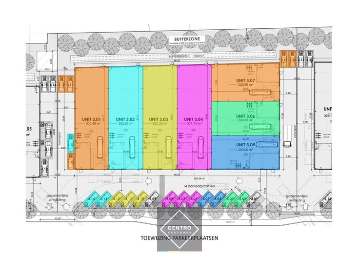 - Betonplinten: 14 cm dikte onder cellenbetonpanelen tussenwanden units – geïsoleerd (10cm PIR) en 28cm dikte onder metalen sandwichpanelen achtergevel en onder buitenschrijnwerk langs voor -en eventuele zijgevels.