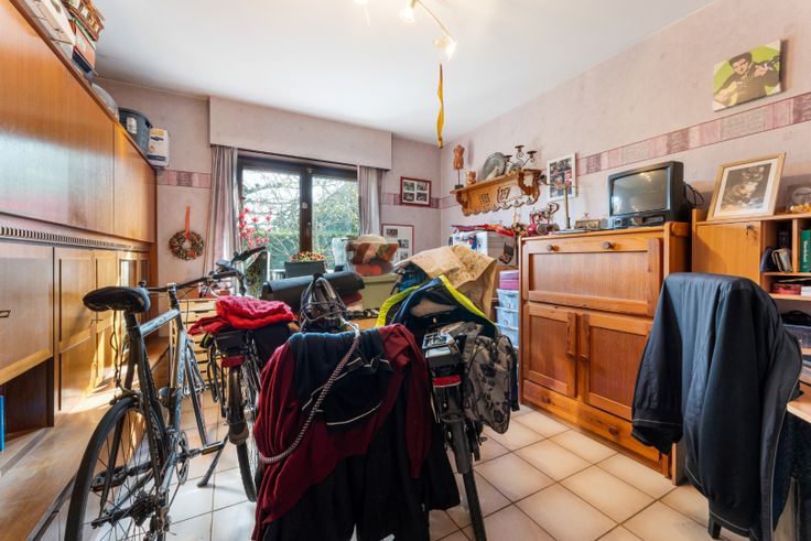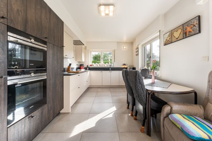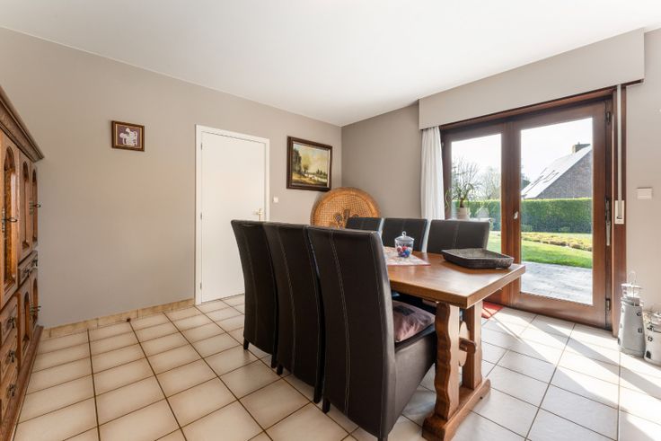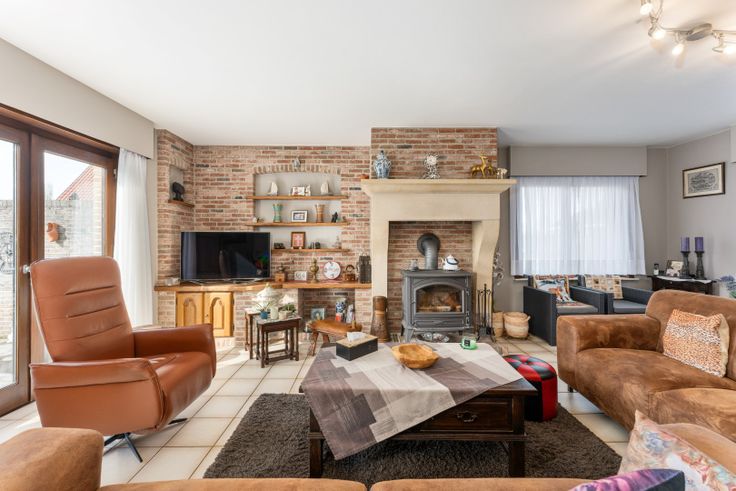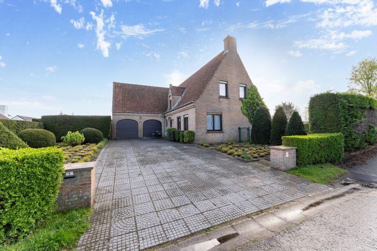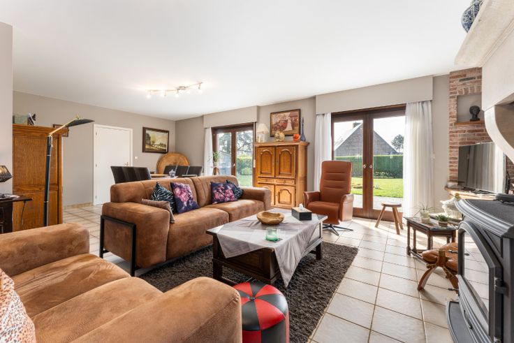 Indeling: inkomhal met gastentoilet, zeer ruime, lichtrijke leefruimte met houtkachel, afzonderlijke, ingerichte keuken, bureelruimte/slaapkamer, dubbele garage, ruime kelder.