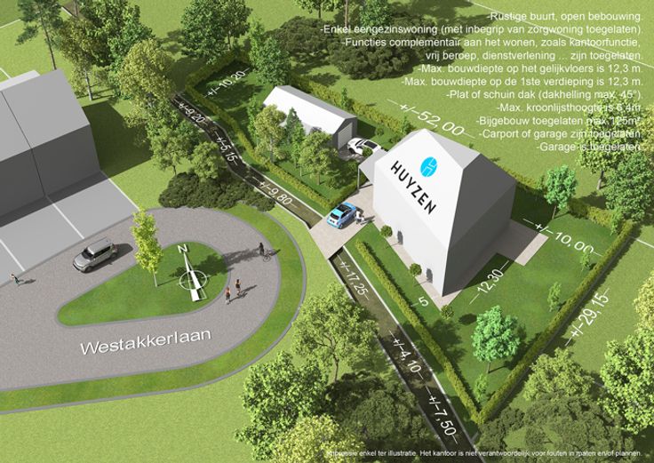 De totale straatbreedte bedraagt 52 meter. De diepte van het perceel bedraagt 23m. De verkavelingsvoorschriften voorzien in de oprichting van een open bebouwing met bijgebouwen. De minimale voorgevelbreedte bedraagt 13,85m en een bouwdiepte op het gelijkvloers van 12.30m en 12.30m op de eerste verdieping.