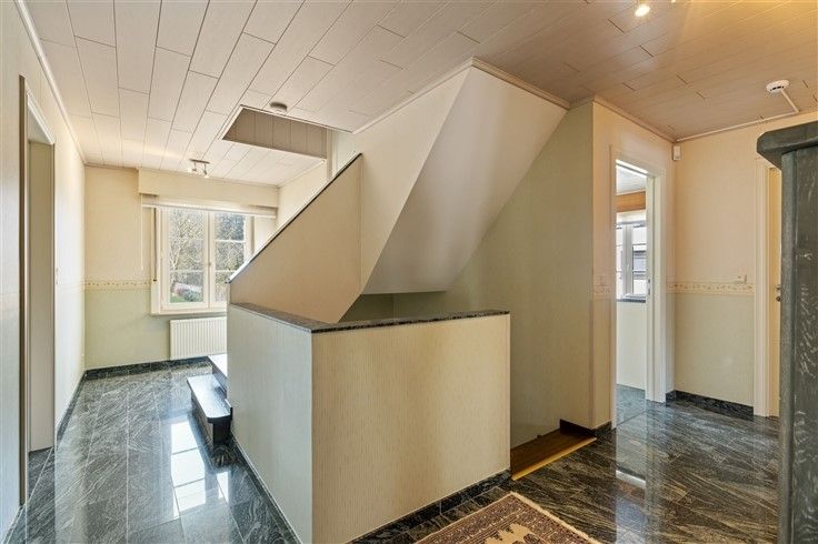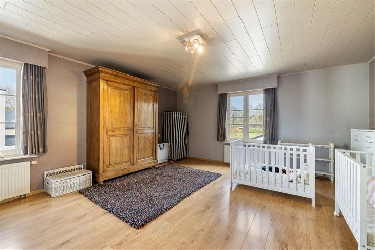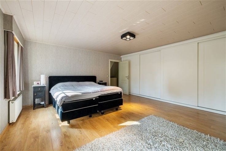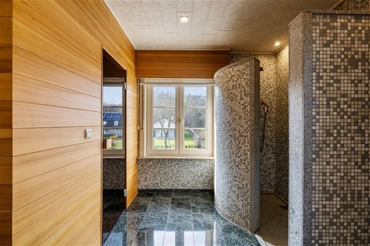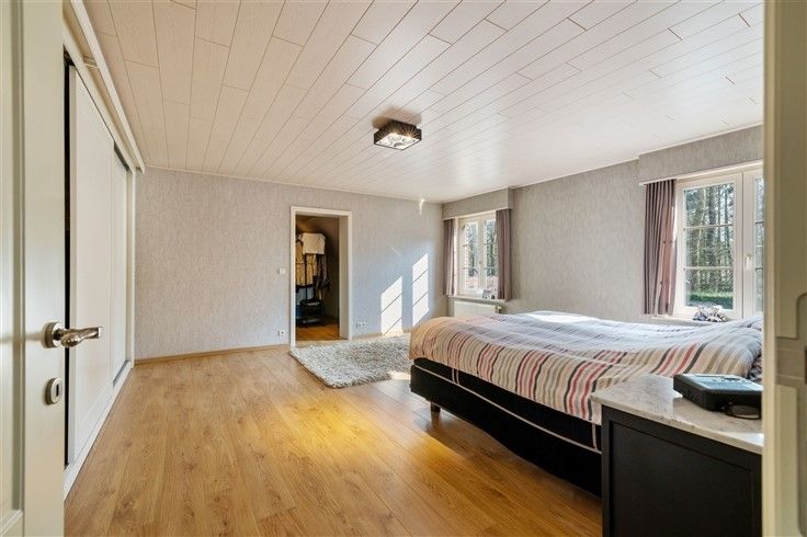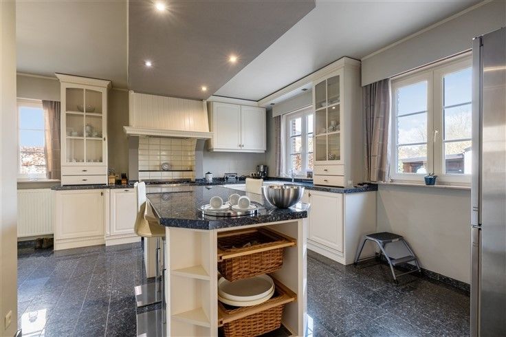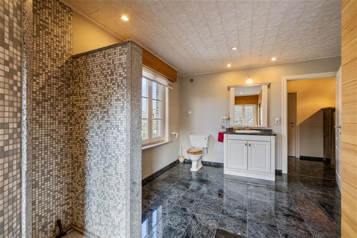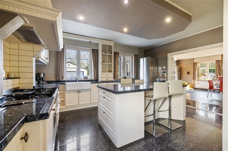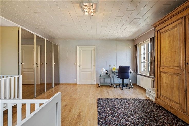 INDELING: Gelijkvloers: Ruime oprit met plaats voor meerdere wagens, afgesloten door automatisch schuifhek; Riante inkomhal met gastentoilet; Bureau/extra slaapkamer (16m²), toegankelijk vanuit de inkomhal; Douchekamer met douche + lavabo; Lichtrijke woonkamer (60m²) met gezellige zithoek in erker & authentieke speksteenkachel; Aangename leefkeuken in onberispelijke staat van onderhoud en klassiek landelijke stijl met o.a. een 6 pits gasfornuis en granieten werkblad; Koele berging aan keuken; Inpandige garage met automatische sectionaalpoort; 2e garage, achteraan het perceel + carport; Mooi aangelegde tuin met o.a. vijver en veel privacy.