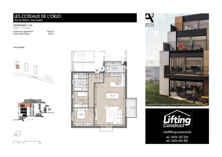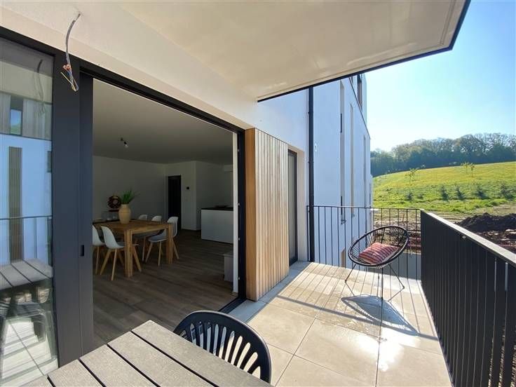 Ontdek deze nieuwe energiezuinige flat van ongeveer 119 m². Gelegen in een condominium complex van 26 appartementen in 3 gebouwen, ligt het dicht bij de stad (hoofdwegen, winkels, scholen, openbaar vervoer, enz.), maar biedt toch een rustige, landelijke omgeving. Het complex ligt naast een bos dat een aangename wandeling biedt naar Géronsart. Je zult genieten van de ruime, lichte woonruimtes, het goed georiënteerde privéterras en de energiezuinige voorzieningen (vloerverwarming, dual-flow ventilatie, aluminium ramen, enz.) Het bestaat uit een inkomhal met toilet, een woonkamer die uitgeeft op een ingerichte keuken van 53 m², een bijkeuken, 2 slaapkamers en een badkamer (bad en douche). Een parkeerplaats buiten is inbegrepen. Kelder beschikbaar tegen meerprijs.