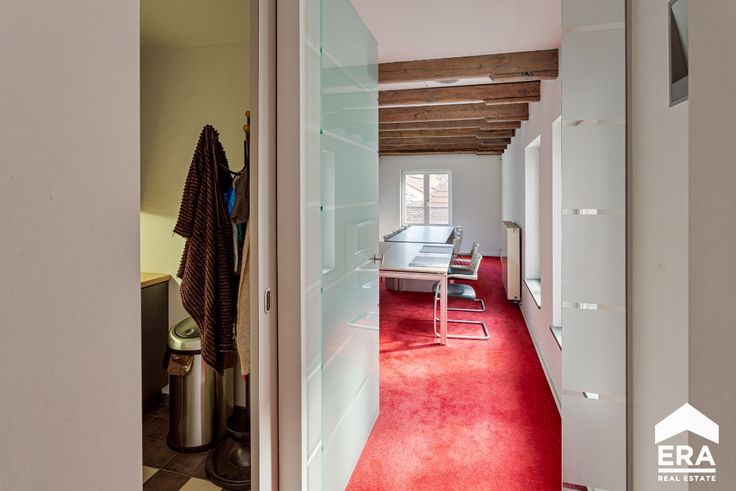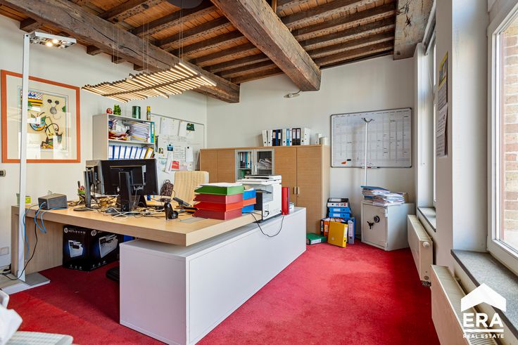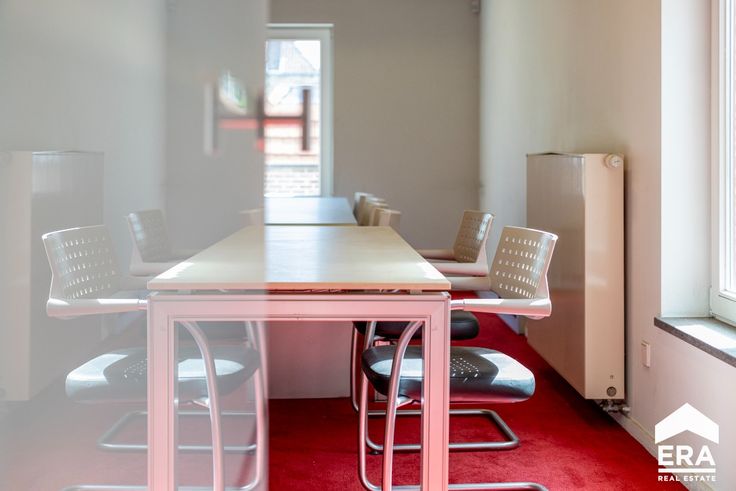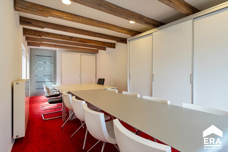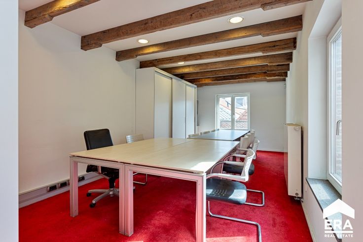Op de eerste verdieping vinden we een grote vergaderzaal, 3 grote burelen, een keuken en toilet.